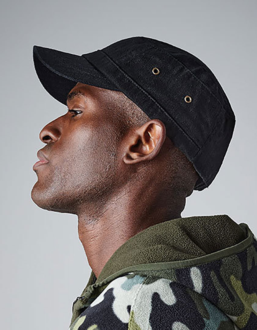 Sandwich Cap im Military-Stil aus robustem Baumwollcanvas Oberstoff: 100% Baumwolle 4 seitlich angeordnete Metallösen, gefüttertes Baumwollschweißband, Klettverschluss