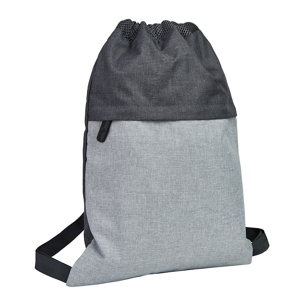 Turnbeutel Material: 100% Polyester 600D Polyester Turnbeutel in dunkel- und hellgraumeliert, ein großes Hauptfach, lässt sich durch Zuziehen der seitlichen, dunkelgrauen Schultertragegurte verschließen, geräumige Fronttasche mit verdecktem Reißverschluss, Tunnelzug aus dunkelgrauem Air-Mesh, Reißverschluss in Schwarz, Gummi-Zipp-Puller mit „bags2GO“-Prägung, Volumen: ca. 1,5 Liter Grösse: 43 x 33 cm