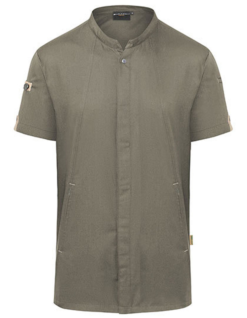 Innovative nachhaltige Kochjacke mit kurzen Ärmeln, die urbanen Style mit natürlichem Flair verbindet