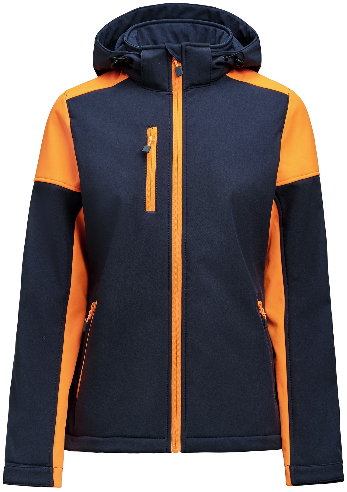 Zweifarbige Damen Softshelljacke mit abnehmbarer Kapuze.