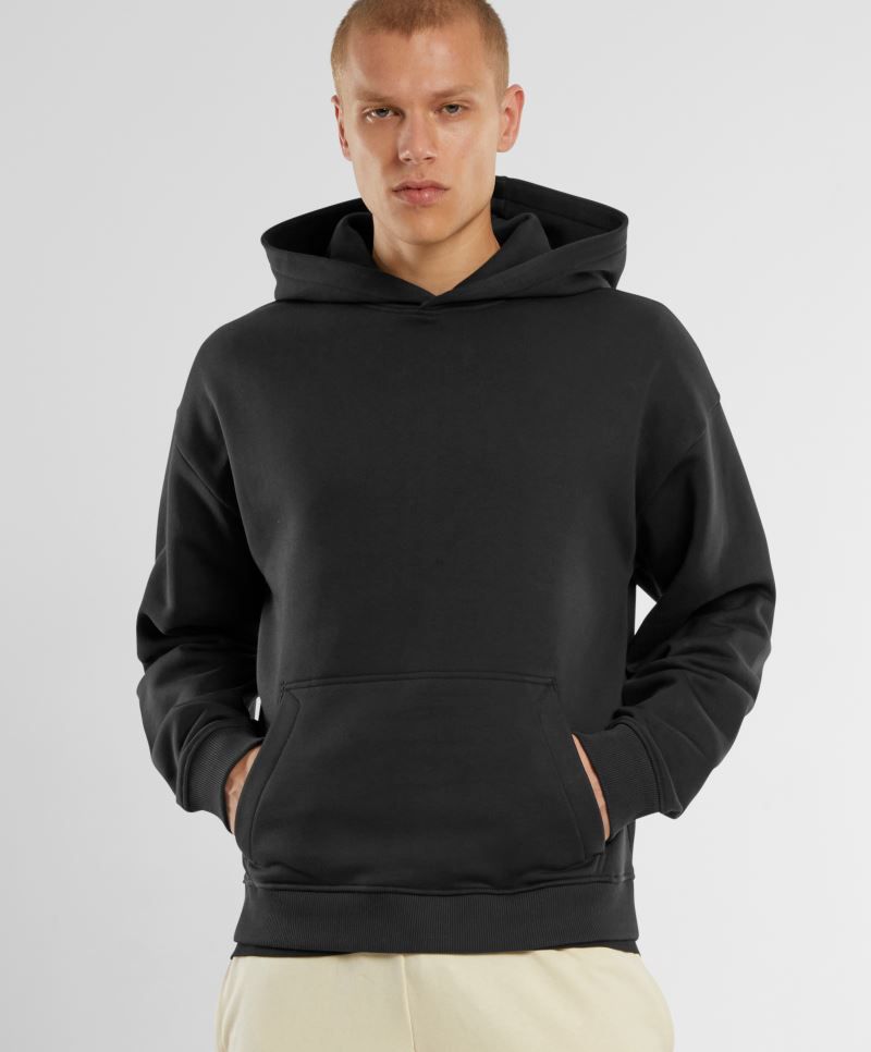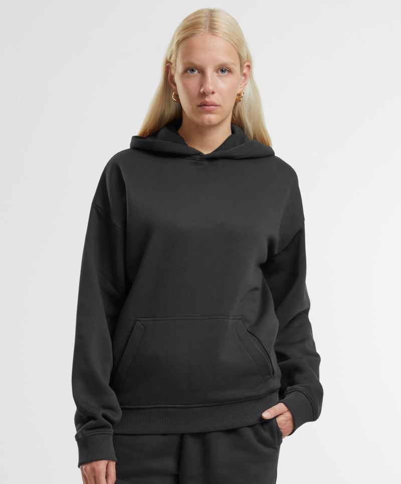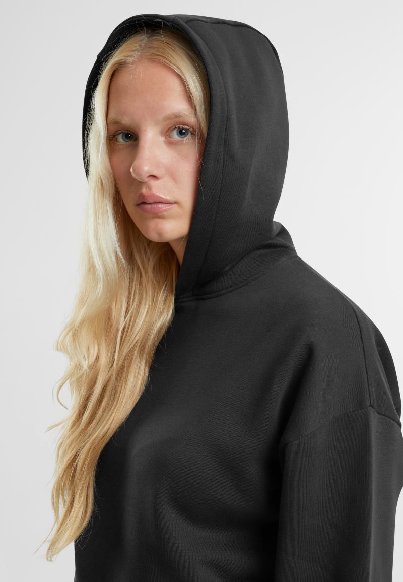 Oversize Schnitt, gefütterte Kapuze ohne Kordel, Rippstrickbündchen an Ärmel und Saum, Kängurutasche, innen angeraut, neutrales Grössenlabel, 30° waschbar