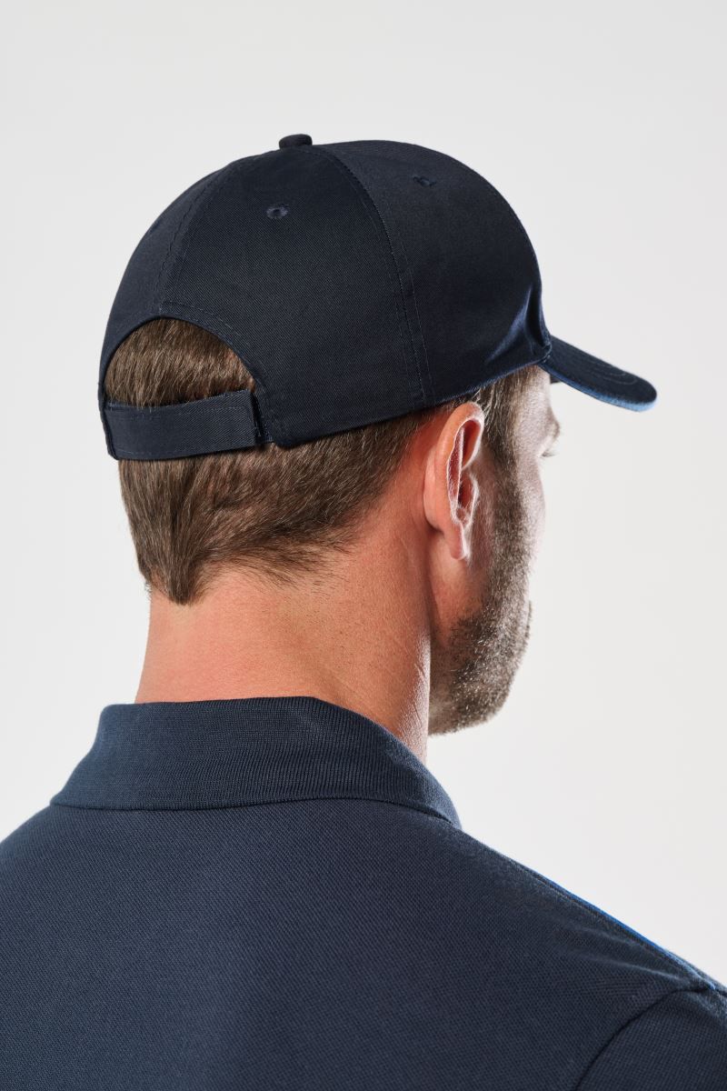 65% coton / 35% polyester. Casquette 6 panneaux. Fermeture arrière réglable par bande auto-agrippante.