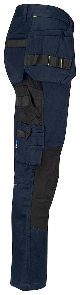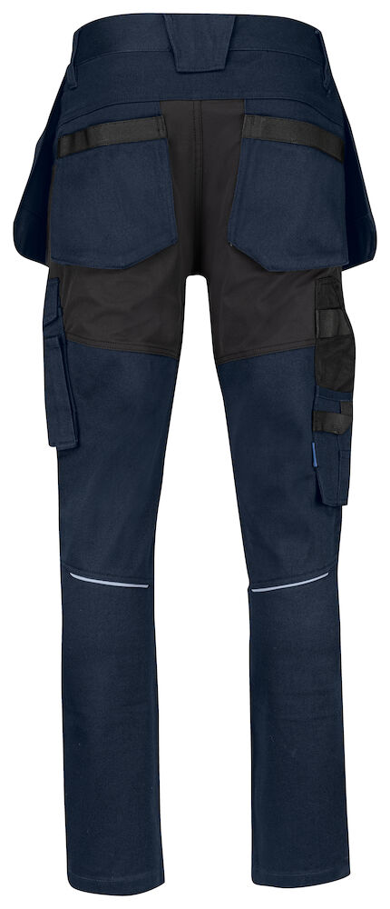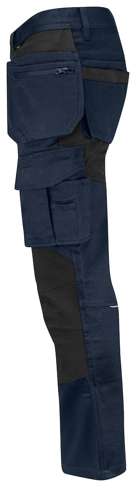 Pantalon à base de coton durable avec tissu extensible Cordura® au niveau du fessier et de l’entrejambe pour une liberté de mouvement accrue. Poches flottantes avec compartiments supplémentaires et renfort interne en Cordura® ; les poches flottantes peuvent être retirées si nécessaire en défaisant les coutures contrastées à l’arrière. Poches spacieuses des deux côtés sur les jambes. Poche de la jambe gauche pour outils et stylos, une poche pour le téléphone avec fermeture aimantée et un support pour fixer la carte d’identification. Sur le côté droit, poche pour mètre pliant et poche à outils avec porte-couteau. Genoux pré-formés. Inserts pour genouillères, réglables en hauteur sur deux niveaux.