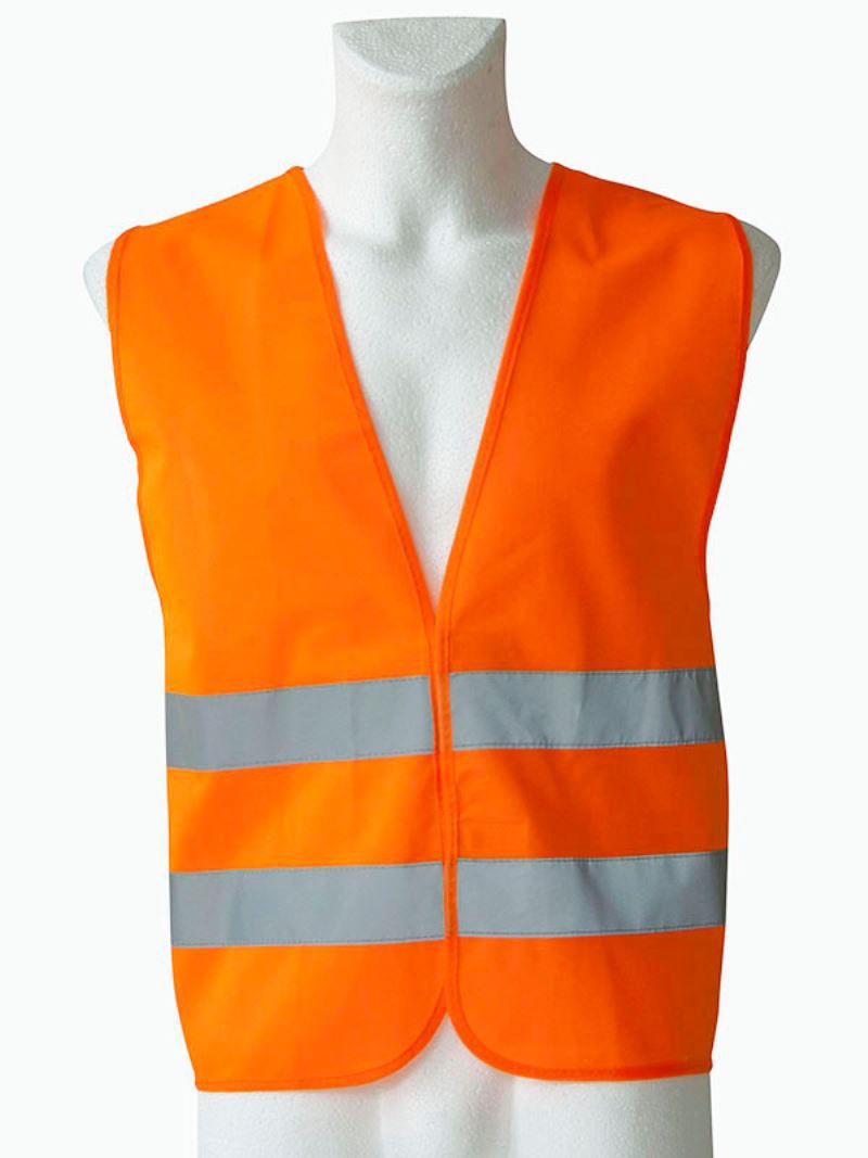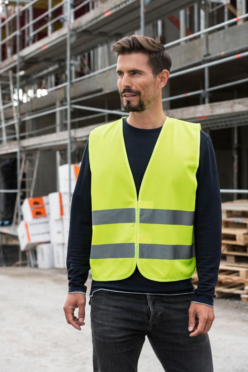 Réglage de la taille à l'aide de 2 fermetures velcro, convient comme gilet de sécurité pour automobilistes, certifié selon la norme EN ISO 20471, deux bandes réfléchissantes de 5 cm de large autour du corps.