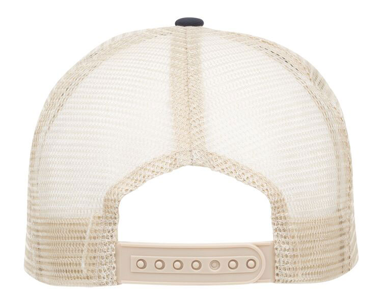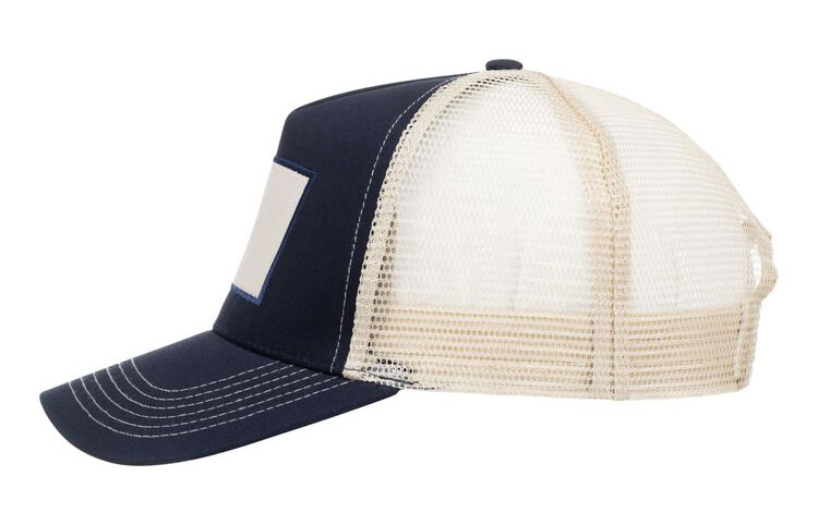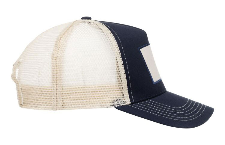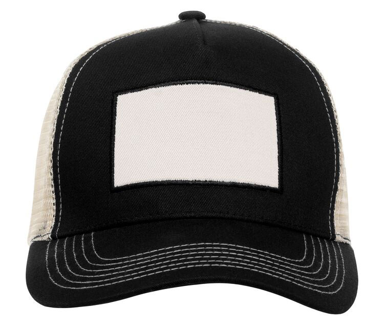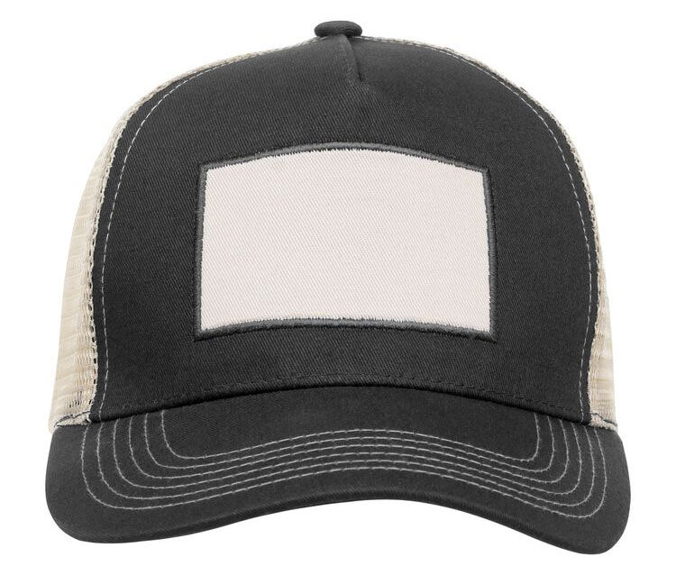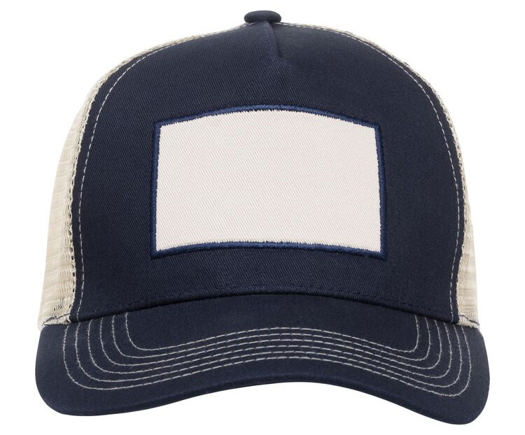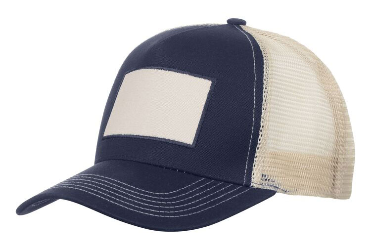 Casquette trucker 5 panneaux avec écusson en twill de coton.