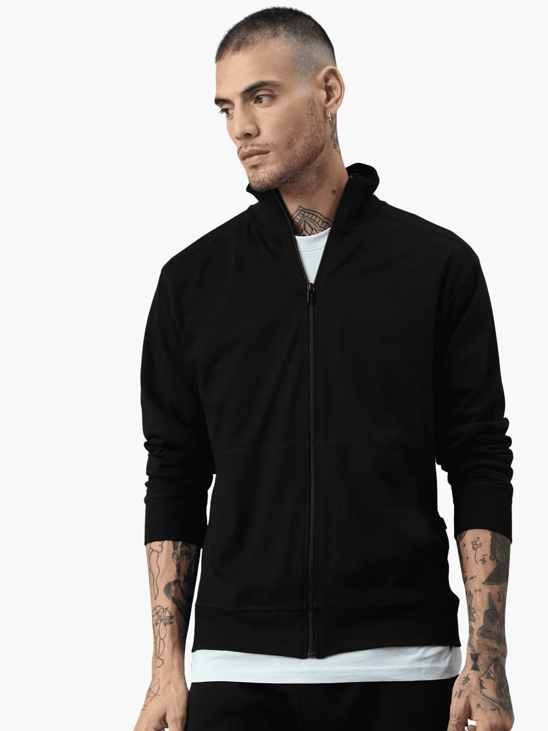 Manches montées. Bords-côtes aux poignets et à la taille. Coupe droite,