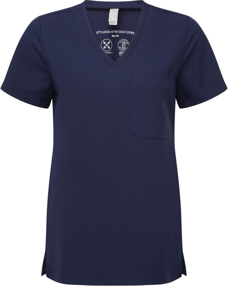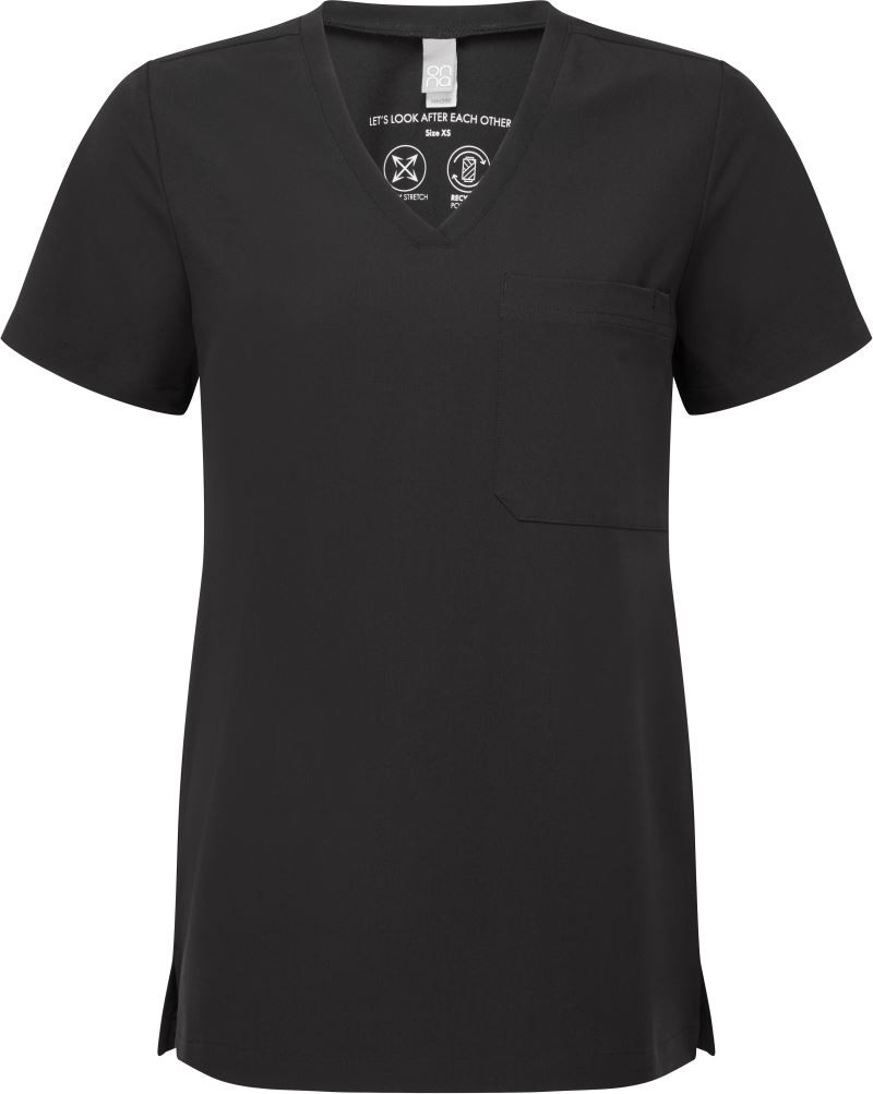Respirant, col en V, poche poitrine à gauche, fentes latérales, pinces au dos, matière stretch 4 directions, matière résistante, infroissable, facile d'entretien, régulation de l'humidité, lavable à 40°, séchage en tambour à basse température, nettoyage à sec interdit