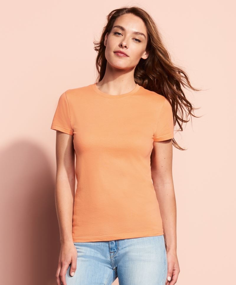 Tee-Shirt femme col rond Qualité: JERSEY 150, 100% coton semi-peigné Ringspun Bande de propreté au col, Col avec bord côte, Manches courtes, Coupe cintrée, Coupé cousu Tailles: S – XXL