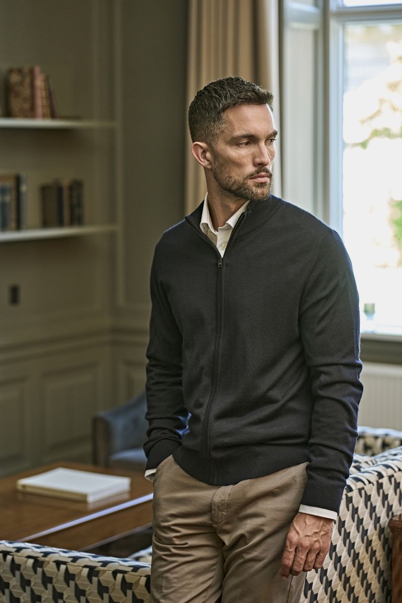 Coupe légèrement cintrée, bords-côtes aux manches et à l'ourlet, fermeture éclair SBS dissimulée, tricoté en une seule pièce, fil mélangé italien, régulateur d'humidité, lavable à 30 °C en cycle laine, ne passe pas au sèche-linge