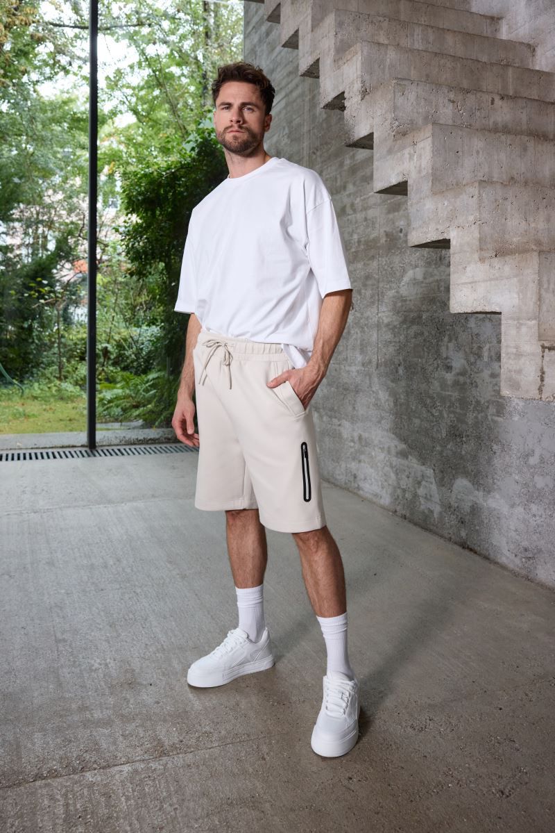 Taille élastique avec cordon de serrage, poche zippée à l'avant, 2 poches latérales, poche arrière zippée