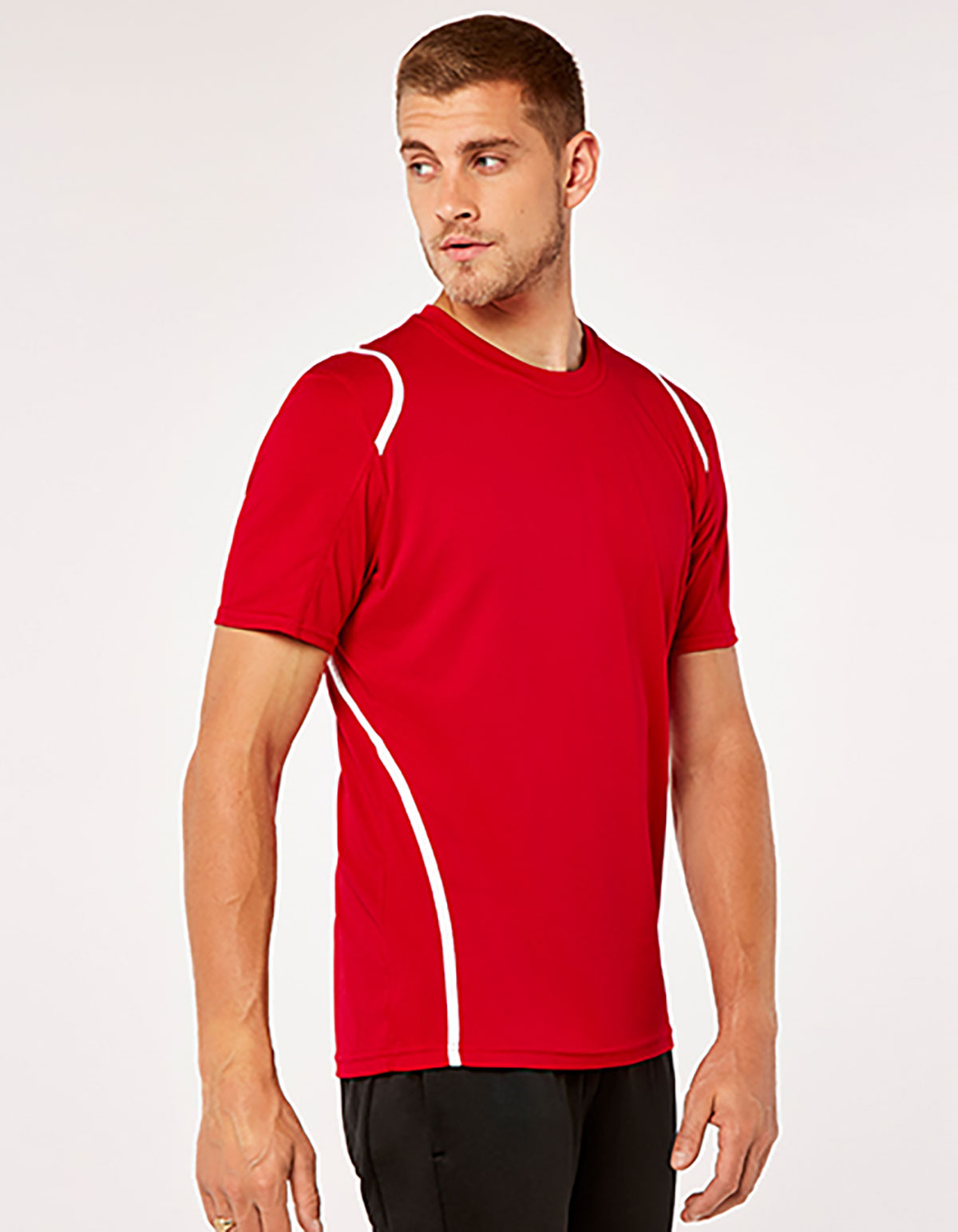 Matériau respirant/gestion de l'air, Col bordé, Coutures plates, Couleur contrastée de l'épaule au dos et jusqu'aux côtés de l'ourlet, Coupe droite à l'avant et arrondie à l'arrière