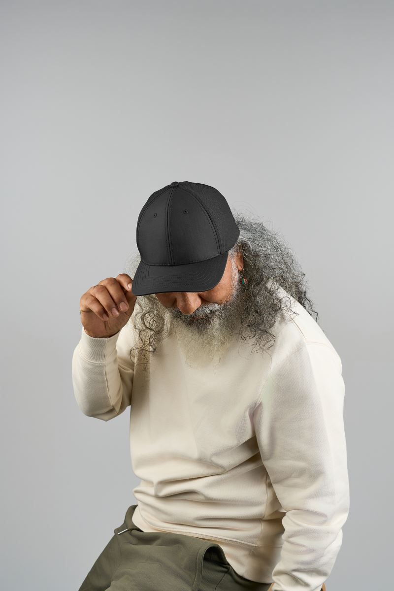 150 g/m², côtés et arrière : 95 % polyester recyclé, 5 % élasthanne, visière et devant : 100 % polyester recyclé, sergé