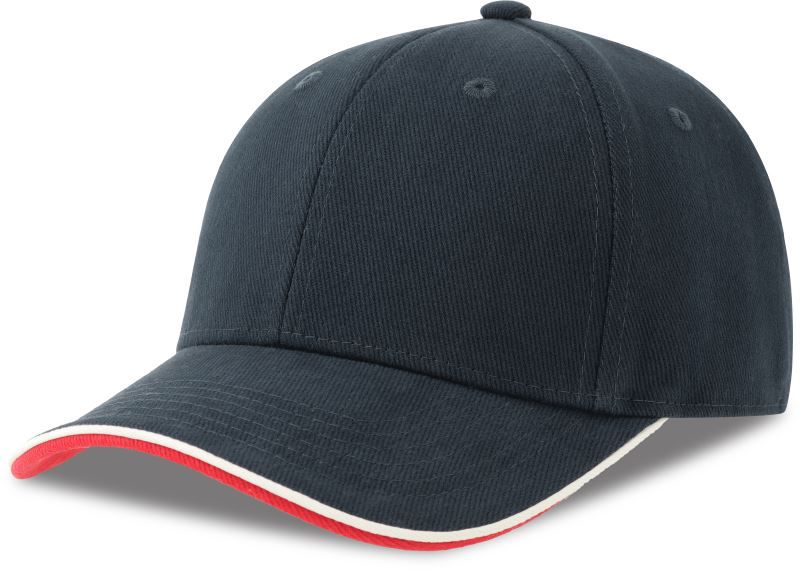 Modèle durable succédant au Pilot Piping Sandwich (article : 33.0502), visière avec passepoil de couleur contrastée, visière préformée, dessous de visière de couleur contrastée, buckram recyclé, intérieur de la visière en plastique recyclé, profil de casquette plus haut, panneaux avant laminés, bande de tissu avec fermeture métallique, surface douce brossée, étiquette TearAway, lavage à la main, ne pas repasser, ne pas utiliser de sèche-linge, ne pas nettoyer à sec