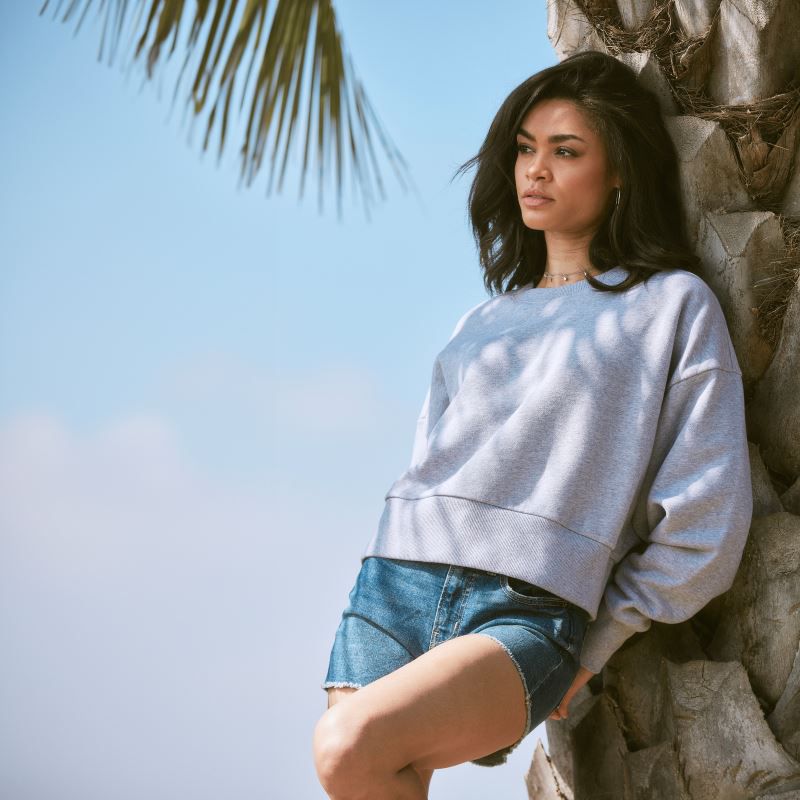Coupe courte, oversize, demi-lune dans le cou, bandeau dans le cou, épaules recouvertes, 2x2 bords-côtes au cou, aux manches et à l'ourlet, qualité sweat 3 fils, surface 100% coton, intérieur gratté, étiquette TearAway