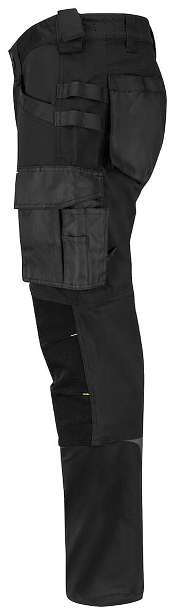 Pantalon slim fit entièrement stretch pour une liberté de mouvement et un confort maximum. Coupe moderne. Stretch en 4 directions sur les cuisses et le fessier, étirement en 2 directions à l'arrière des genoux et à l'extérieur de la partie inférieure de la jambe. Ouvertures d'aération avec fermetures éclair sur les deux côtés des jambes, ventilation à la taille également. Poches sur les jambes, sur le côté gauche poche pour outils et stylos, une poche pour téléphone avec fermeture velcro et un support pour attacher une carte d'identité. Sur la poche latérale droite pour mètre pliant et poche pour couteau avec bouton. Deux boucles de marteau. Possibilité de fixer le système MOLLE des deux côtés. Détails réfléchissants pour une meilleure visibilité. Embouts de jambes réglables. Genoux pré-courbés. Poches intérieures pour genouillères, réglables en hauteur sur deux niveaux. Les ourlets des jambes sont renforcés de Cordura®, les genoux sont renforcés de kevlar stretch pour une durabilité et un confort accrus.