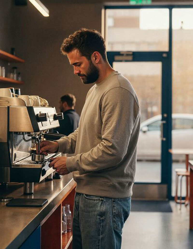 Il est doté d’un col, de poignets et d’un bas-côte 2x1. Le col rond est lavé aux enzymes pour une sensation douce et légèrement “usée”.